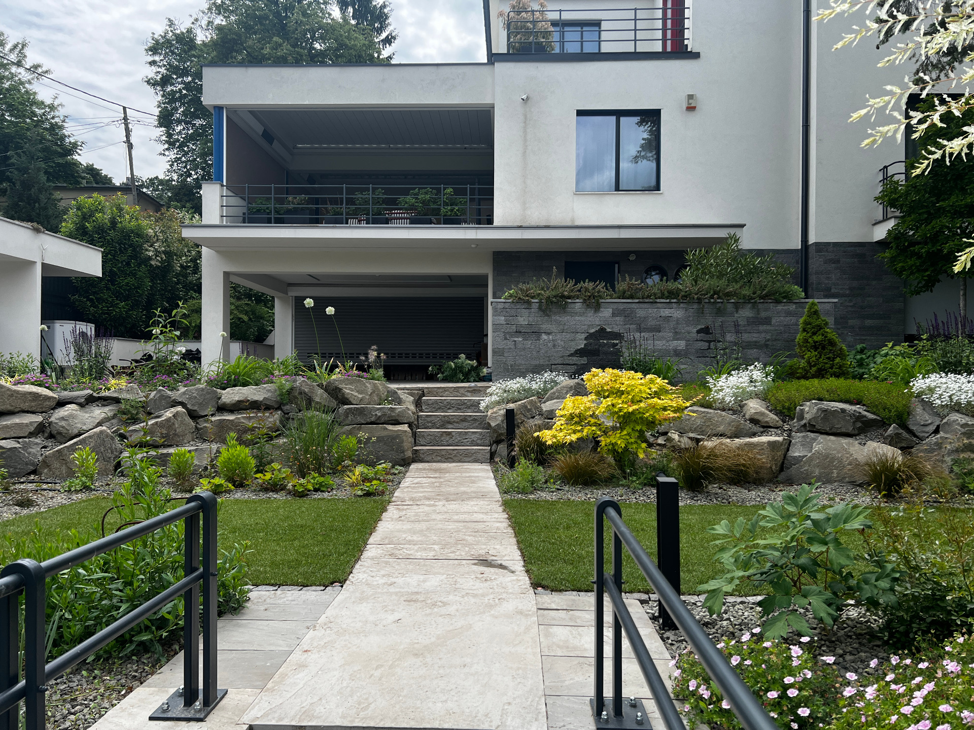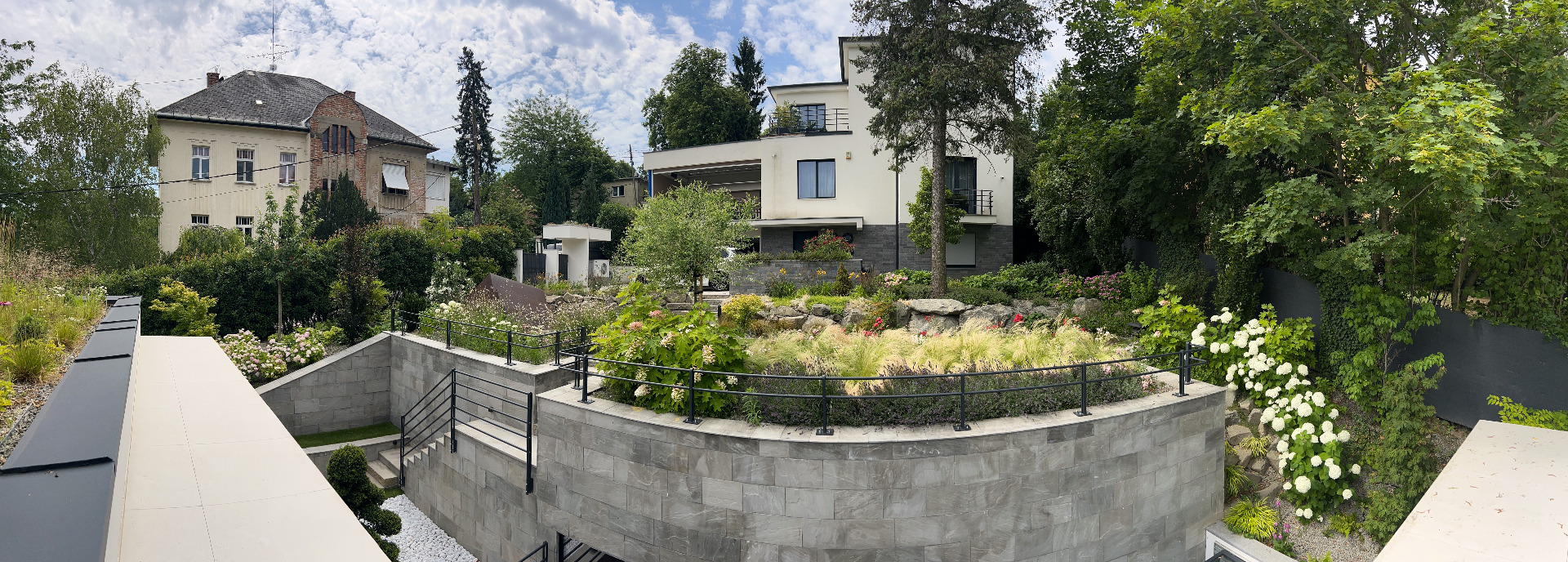 A terület kiváló adottságai természetes módon hívták elő a rézsűk, támfalak és szintváltások játékát. Az épületek letisztult, tudatos designja világos irányt mutatott: a kertnek nem díszletként, hanem az architektúra folytatásaként kellett működnie.