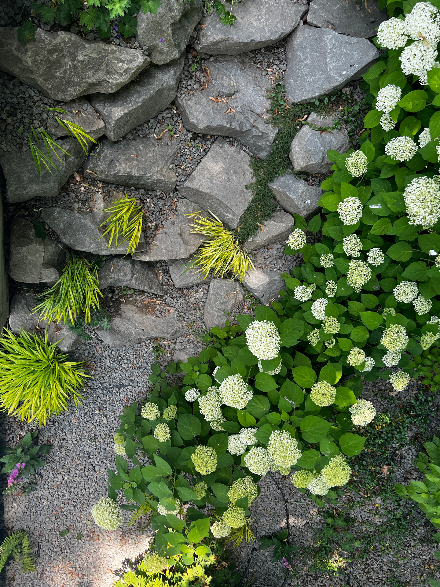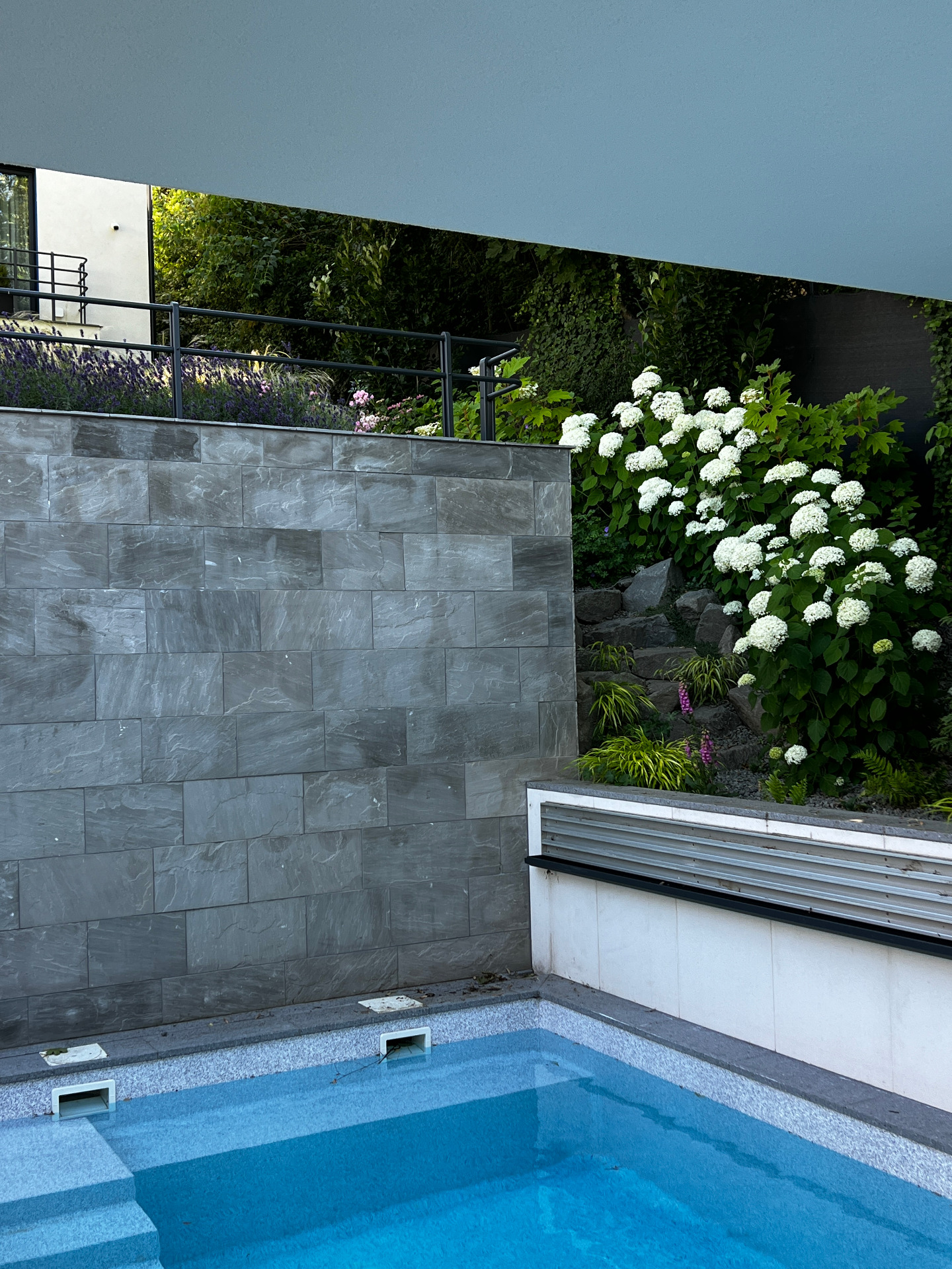 Külön hangsúlyt kaptak az andezit sziklacsoportokból kialakított lépcsők és azok környezete. Az antracit háttér a növények tónusait új megvilágításba helyezi, finom kontrasztot teremtve a zöldek és virágok számára.