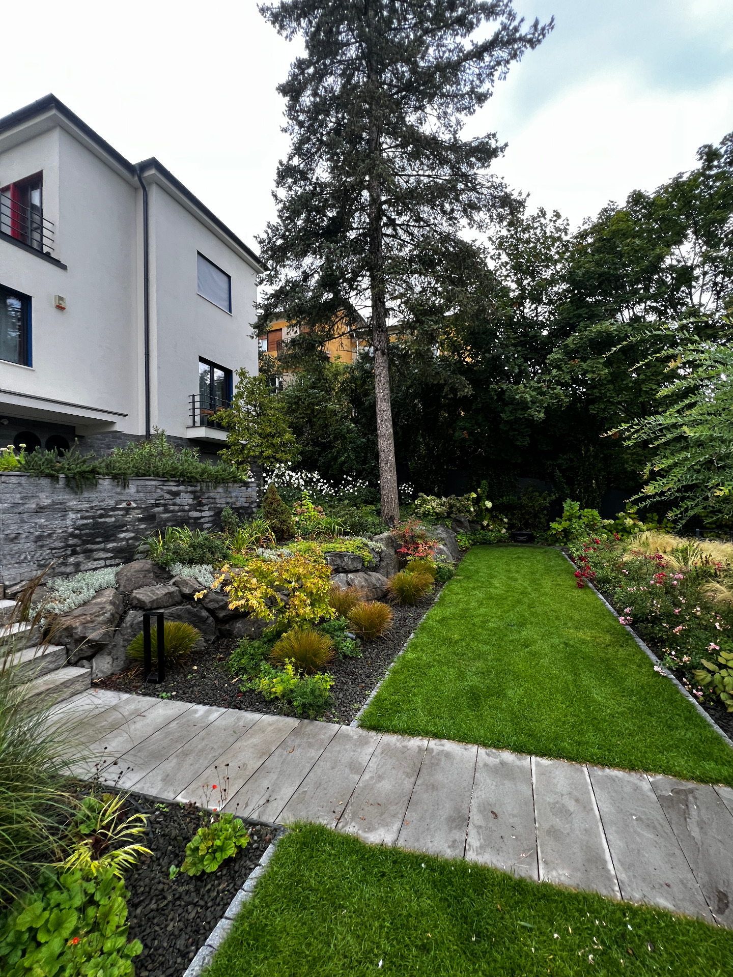 A kertben a tűző napos felületektől a teljes árnyékig lehet sétálni, mégis természetes és egységes marad az élmény. Az éves gondozás és folyamatos jelenlét lehetővé teszi, hogy igényesebb, érzékenyebb növényeket is alkalmazzunk – ezek adják a kert különleges karakterét.