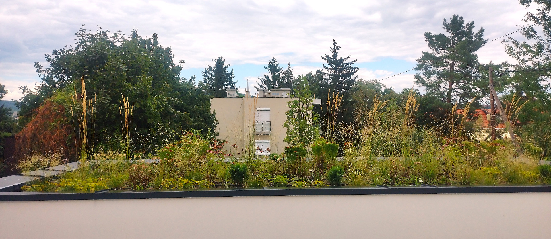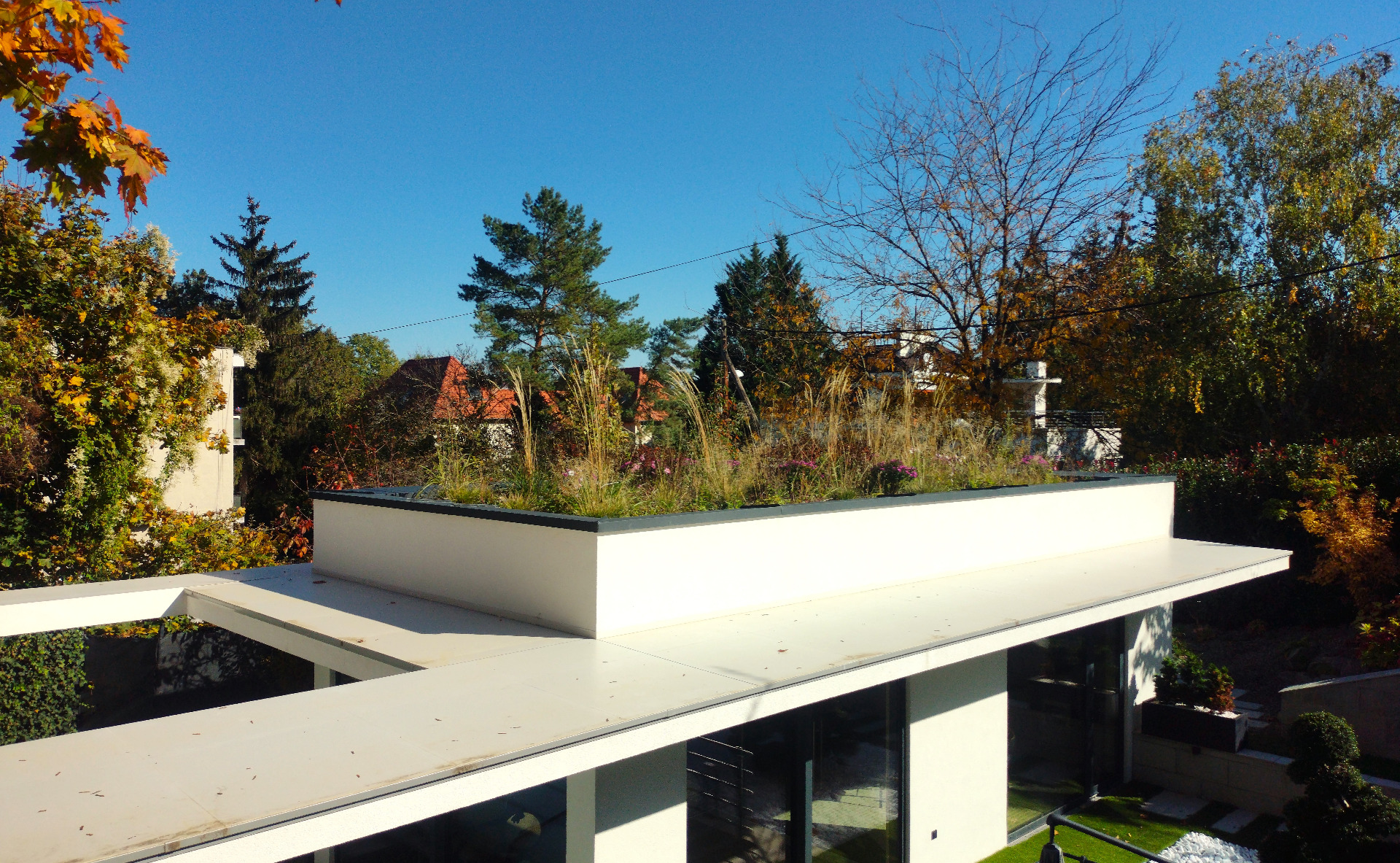 Tavasszal virágzó, nyáron libbenő díszfüvekkel tükröződő felület; ősszel melegebb tónusokra váltó struktúra; télen pedig a textúra finom játéka. Itt a tető él és lélegzik – az év minden napján.