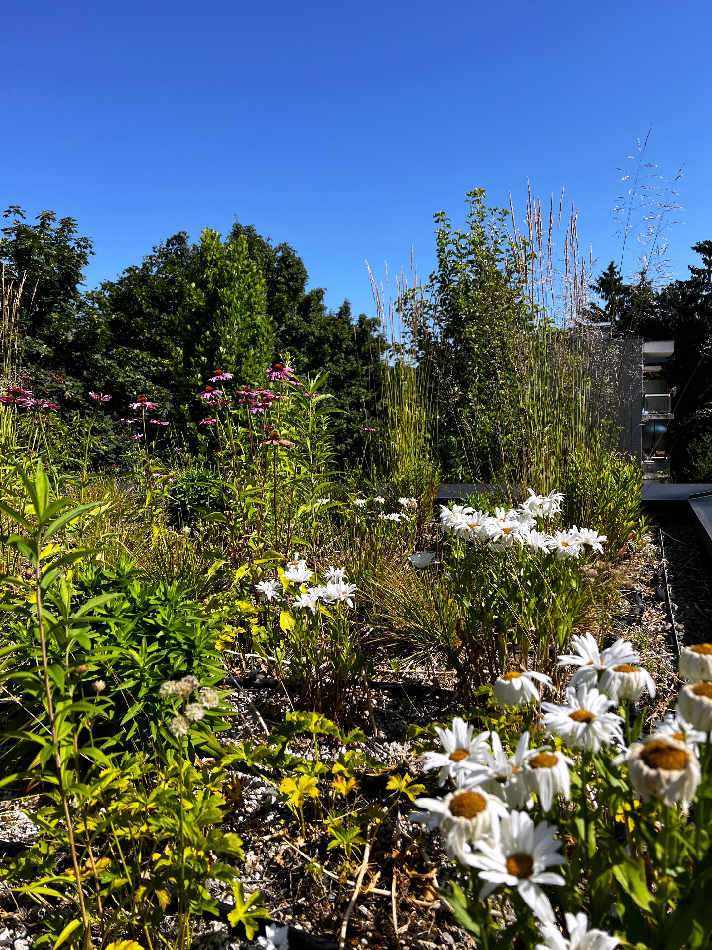 A növénykiültetés kialakítását Piet Oudolf szemlélete inspirálta: évelők és díszfüvek strukturált, mégis természetes hatású társítása, amely az év minden szakaszában karaktert ad a tetőnek.