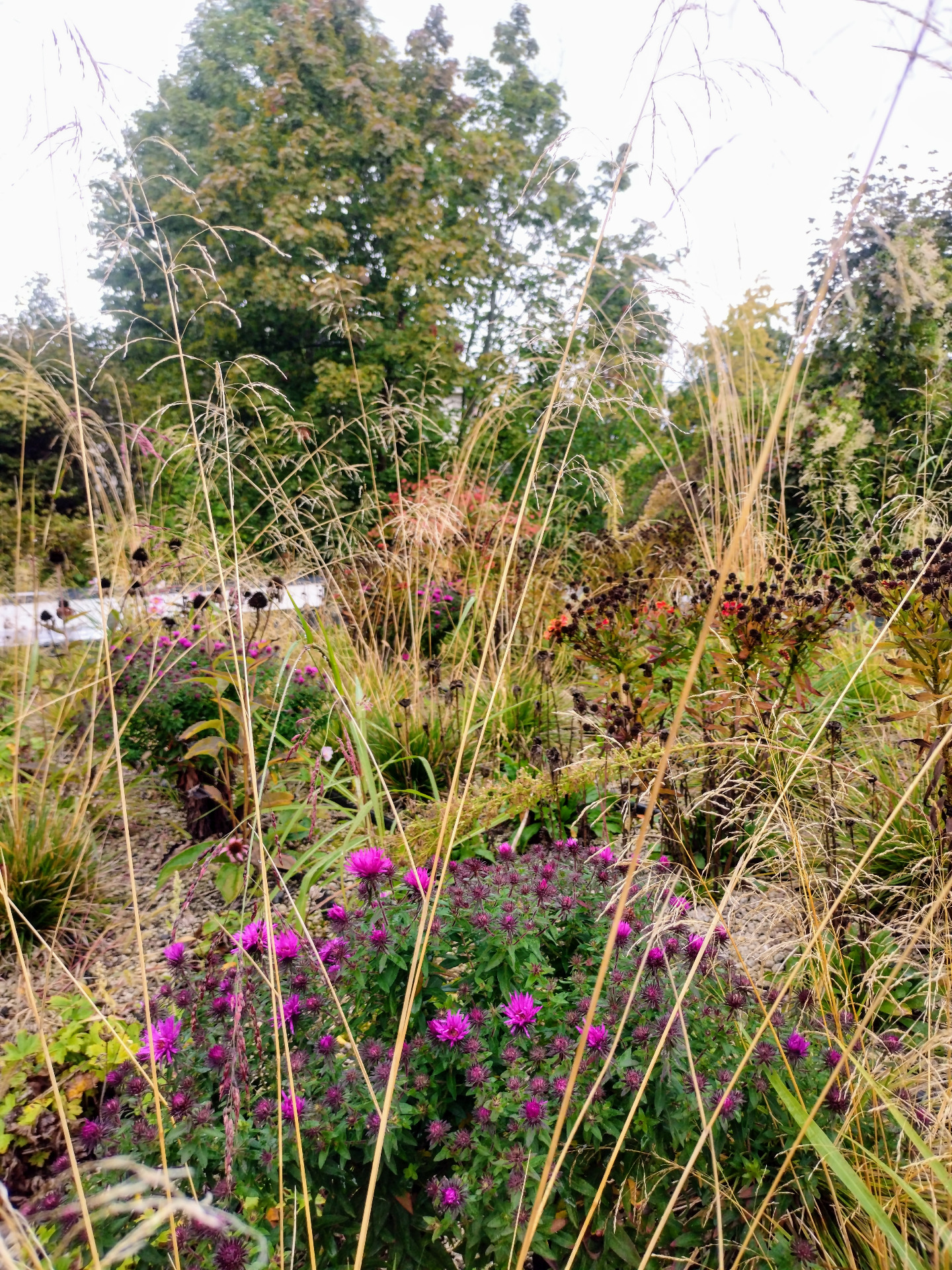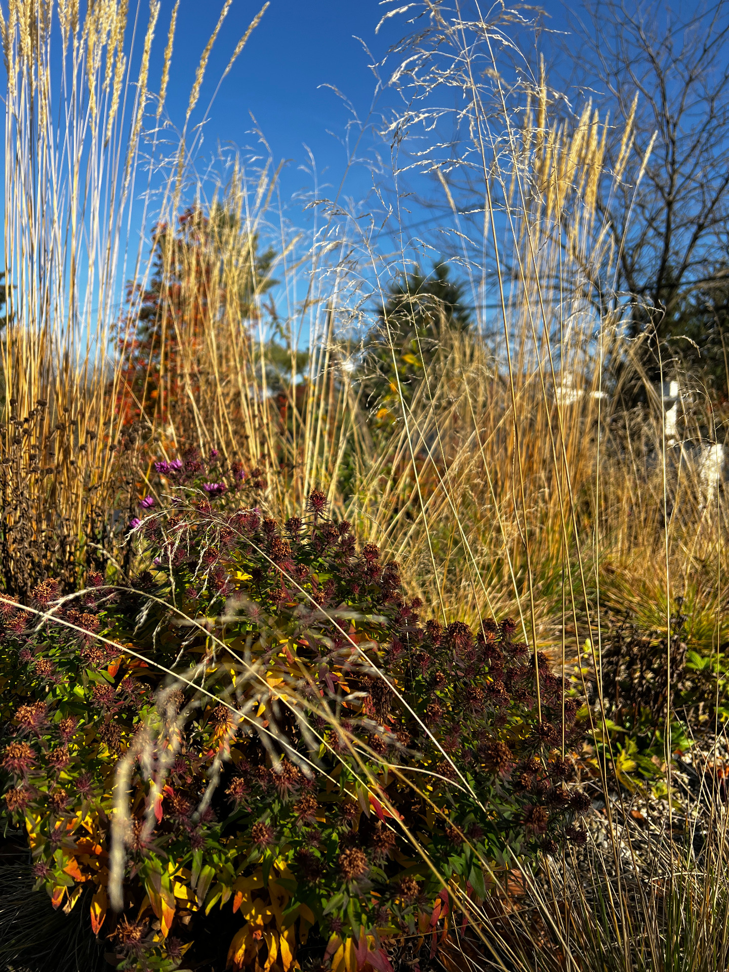 Ősszel a növények tónusa visszafogottabbá válik, a drappos, aranyló színek új hangulatot hoznak. Télen a struktúra kerül előtérbe: a magházak, az elszáradt szárak és a hajladozó füvek rajza adja a látványt. A tető ilyenkor is él, madarak és apró részletek teszik izgalmassá.